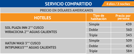 Desayuno. Traslado desde su hotel hacia la fortaleza de Ollantaytambo, única ciudad inca que se conserva casi intacta y en sus casas aún habitan sus descendientes. Traslado a la estación para abordaremos el tren con destino al pueblo de Aguas Calientes. Almuerzo. Instalación en hotel elegido. Pernocte.