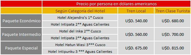 - Los pasajeros que adquieran el paquete con tren local deben de acompañar a nuestro representante a realizar la compra de su boleto en la estación de Perú Rail, dado que el trámite es personal con la presentación de su DNI original.