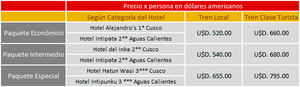 - Los pasajeros que adquieran el paquete con tren local deben de acompañar a nuestro representante a realizar la compra de su boleto en la estación de Perú Rail, dado que el trámite es personal con la presentación de su DNI original.